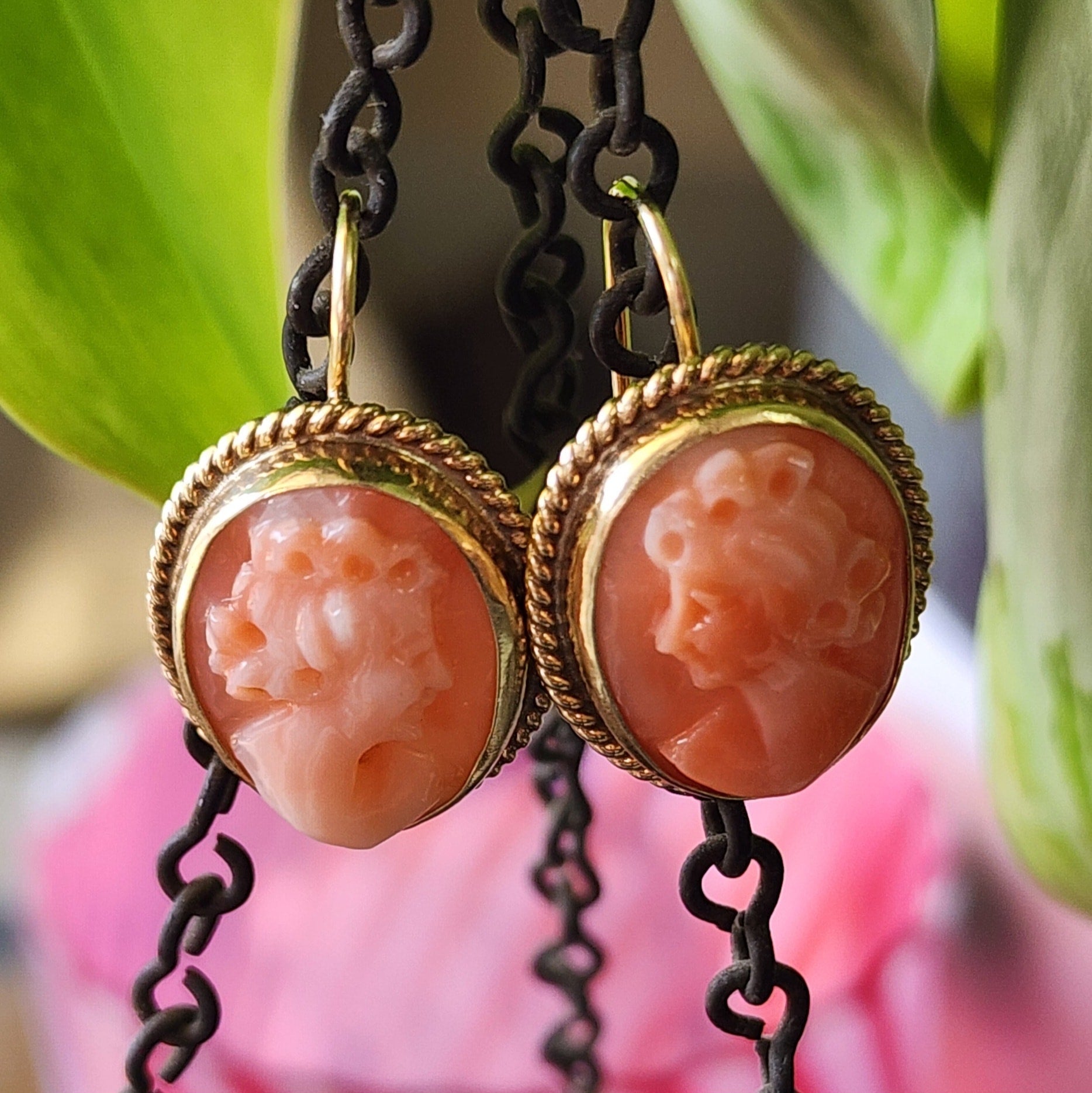 Beautifully elegant! This set of estate cameo earrings are magnificent! The pinkish orange color of the cameo is bezel set in 14kt yellow gold.